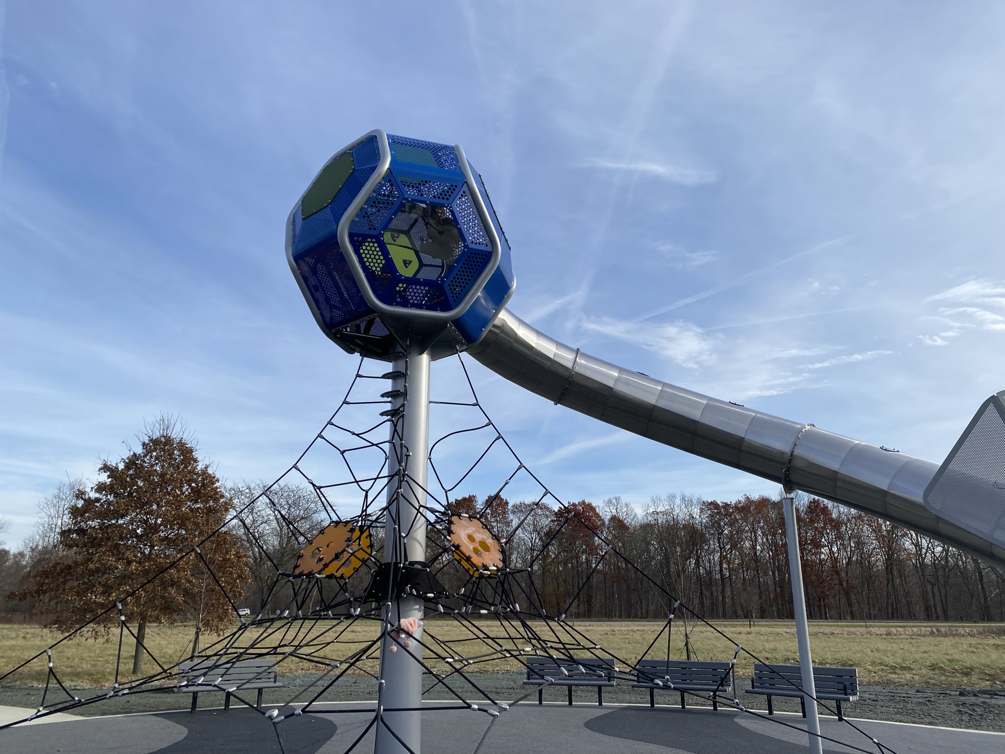 The playground’s centerpiece is its Hedra Tower. In this tall tower, visitors can climb to the top via nets to stand on the circular platform with windows and a giant slide.
