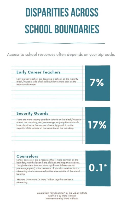 So what are the differences when you cross a zoning boundary line — and the racial dividing line — between schools? It turns out the big three are (surprise, surprise) teacher experience and quality, access to school counselors, and the number of security guards.