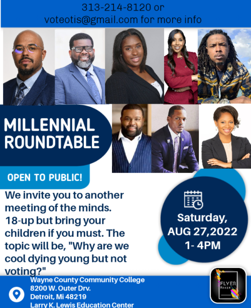 A voter millennial roundtable will be held today from 1 to 4 p.m. on Saturday, August 27 at Wayne County Community College, 8200 W. Outer Drive.