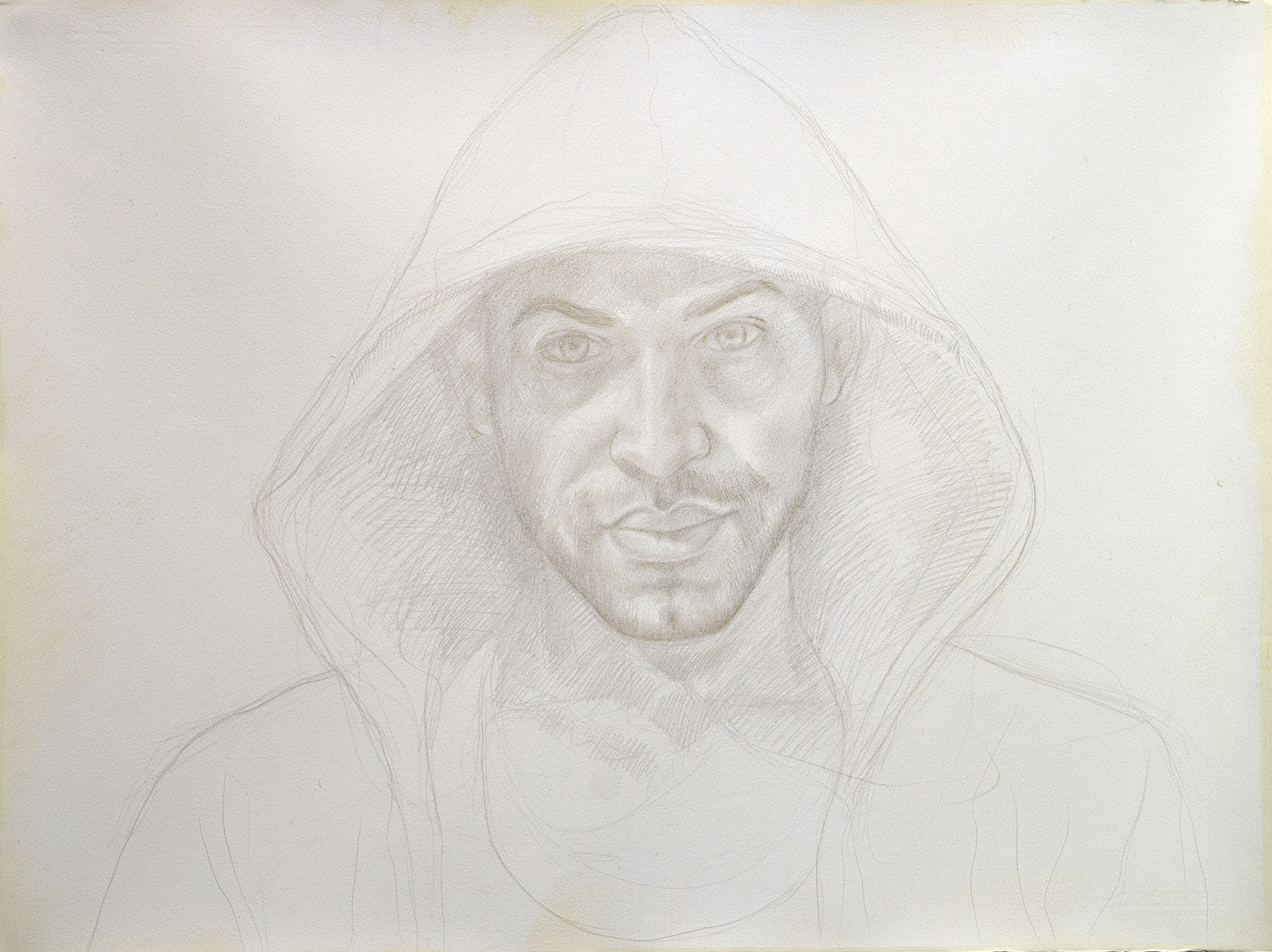 (Hooded study, 2017. Silverpoint on prepared paper, 30 x 22 in.)