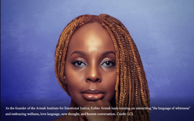 Esther Armah sought a change of scenery for her own emotional well-being, so she relocated to Accra, Ghana, some years back, and now tends oranges in her backyard. It wouldn’t make sense, she says, for her to preach emotional justice — a term she coined in her work centered around racial healing — and not put it into practice.