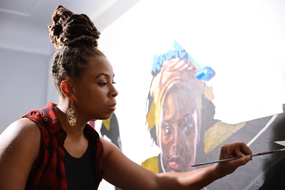 Her portraits and murals seek to reposition this narrative of the black woman’s visibility and importance bringing them to the forefront of the conversation. Influenced by the artists Barkley L. Hendricks, Hubert Massey, Jenny Saville and the Afri-COBRA collective, Sydney’s art expands figurative painting with bold brushwork, colors and imagery.
