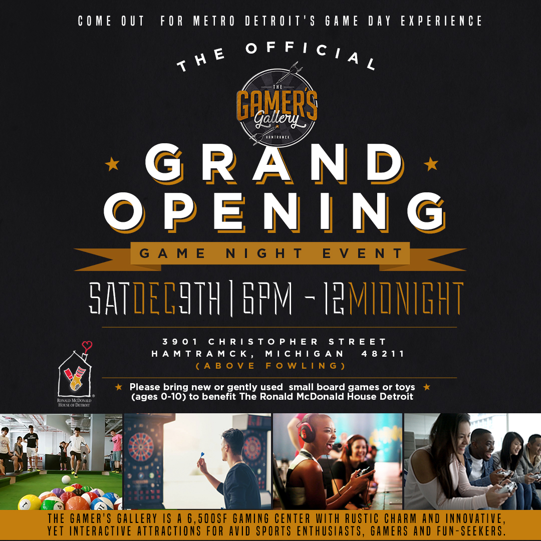 The Gamer’s Gallery will host its official grand opening gaming night event Saturday, December 9th, 2017 6pm until 12midnight at 3901 Christopher St. Hamtramck, MI 48211. The opening event will also serve as a game/toy drive (children aged 0-10) for The Ronald McDonald House of Detroit. For more information including large group reservations and general details please visit www.thegamersgallery.com