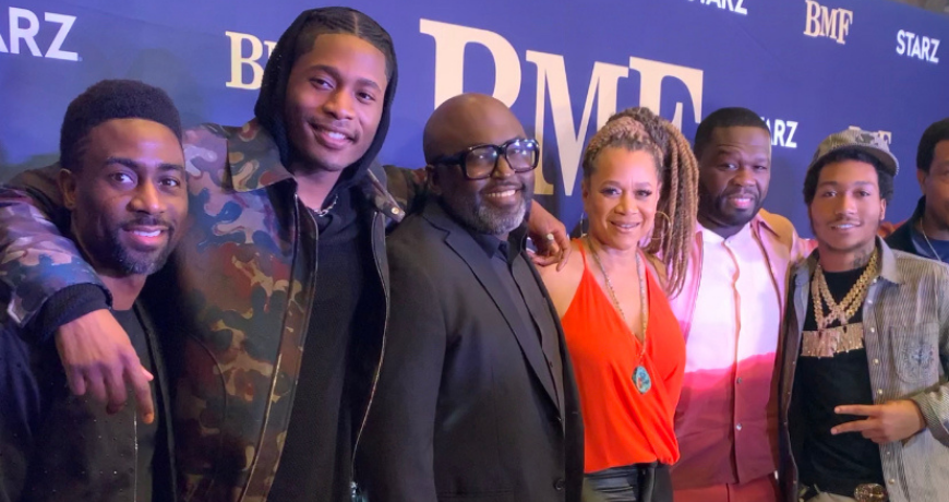 (“BMF” cast photo — from left to right, Holmes Lindsay IV, Da’Vinchi, writer Randy Huggins, Michole Briana White, 50 Cent, Demetrius ‘Lil Meech’ Flenory.)
