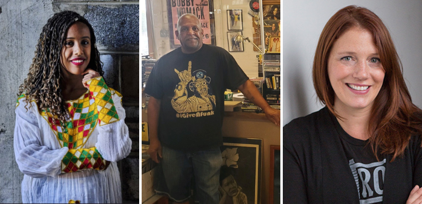 Helina Melaku, left, is the owner of Konjo Me, an Ethiopian food pop up and catering service in Detroit. Redford resident John Frazer, center, owns The Sound Explosion record store in Inkster. Vittoria Katanski, right, is the executive director of Hatch Detroit, an entrepreneurship hub in partnership with Techtown Detroit.