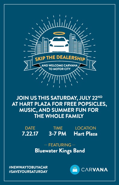 To celebrate its arrival in Detroit, Carvana is inviting residents to take back their Saturday from the dealership and cool off at Hart Plaza on the Detroit Riverfront. This Saturday, July 22, from 3-7 p.m. visitors can enjoy cool treats, music from Bluewater Kings Band and giveaways, all courtesy of Carvana.