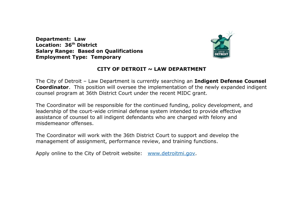 City of Detroit Law Department Indigent Defense Counsel Coordinator Alan Hunt II 6 years ago Visit www.detroitmi.gov to apply.