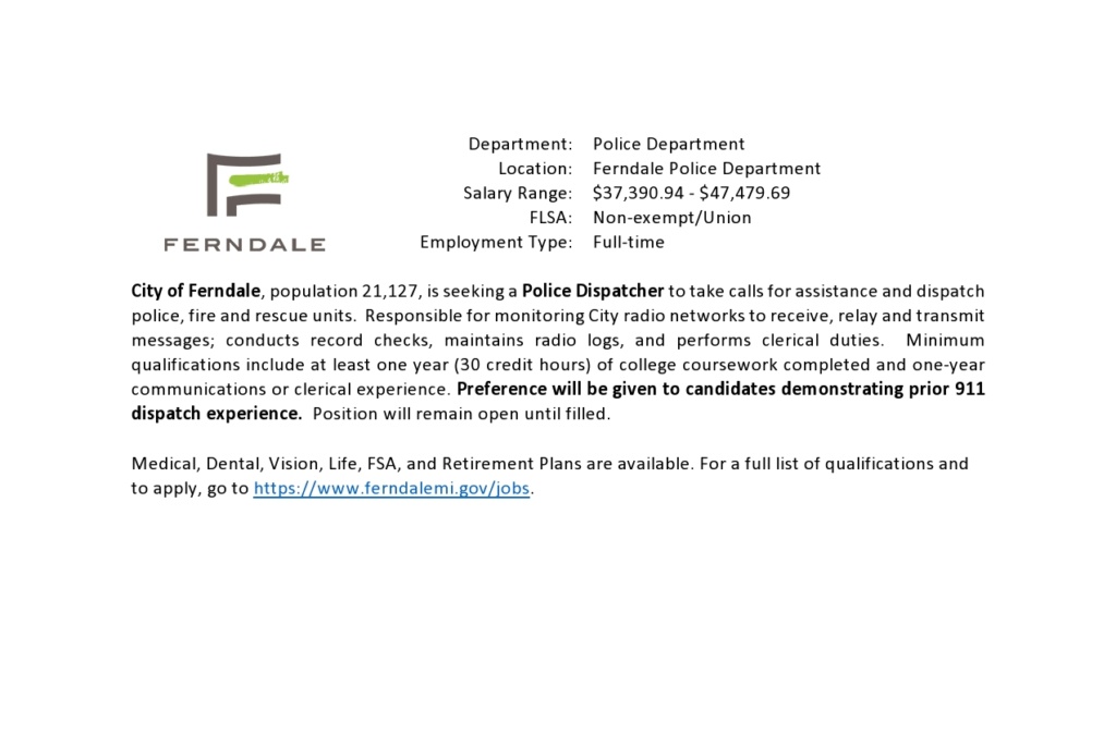 City of Ferndale Police Department Dispatcher Alan Hunt II 6 years ago Visit www.ferndalemi.gov/jobs to apply.