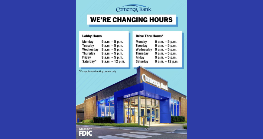 Comerica Bank announced new standard hours across all banking centers, effective as of Sept. 30. Customers can visit banking centers Monday to Friday, 9 a.m. to 5 p.m. and Saturday, 9 a.m. to 12 p.m. (local time), for their financial needs.