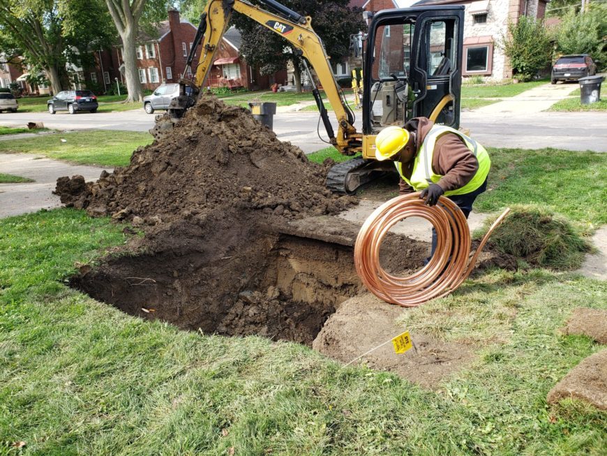 As part of DWSD’s Full Lead Service Line Replacement) program, staff begin community education outreach and contractors are excavating and replacing lead service lines in Detroit neighborhoods (2021).