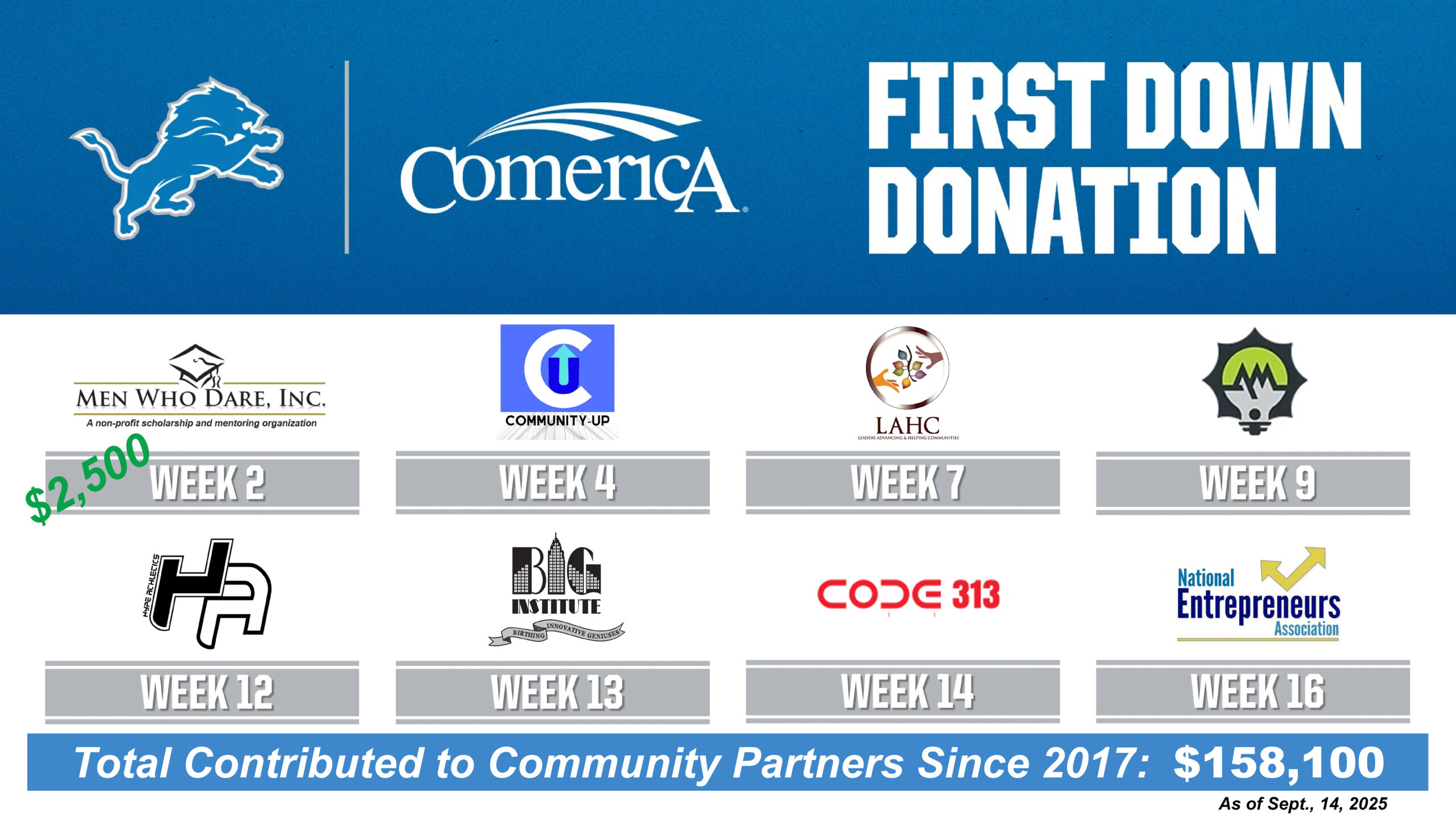 For the eight regular season home games, the Comerica First Down Program will support: Men Who Dare (Sunday, Sept. 14), Community Up (Sunday, Sept. 28), LAHC – Leaders Advancing and Helping Communities (Monday, Oct. 20), Aktive Minds Foundation (Sunday, Nov. 2), HYPE Athletics (Sunday, Nov. 23), BIG Institute (Thursday, Nov. 27), Code313 (Thursday, Dec. 4), National Entrepreneurs Association (Sunday, Dec. 21)