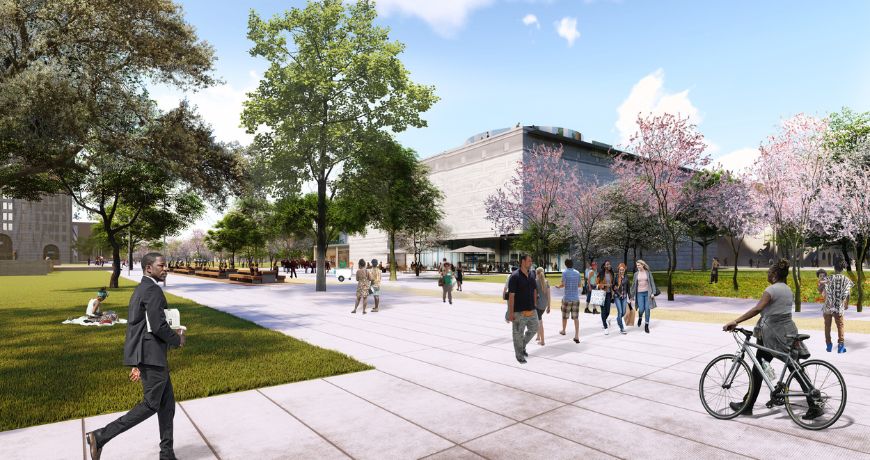 An effort to connect Detroit’s cluster of some of its most significant institutions, including its iconic Detroit Institute of Arts (DIA), within that “Detroit Square,” the project will bring the inside out through “common ground” or communal backyards running between the buildings and their landscapes, to be activated with outdoor cafes, performance spaces, a mobile DJ booth, green spaces, public art, as well as live performance spaces for events. Woodward Avenue, which runs through this district, also may see its massive size reduced.