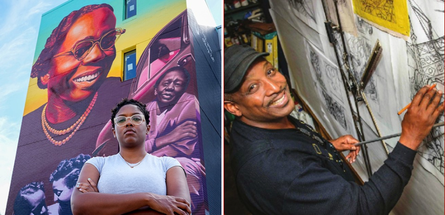 Ijania Cortez, left, stands in front of her mural of LGBTQ Activist Ruth Ellis at the Ruth Ellis Center and Dr. Hubert Massey, right, a renowned artist in Detroit.