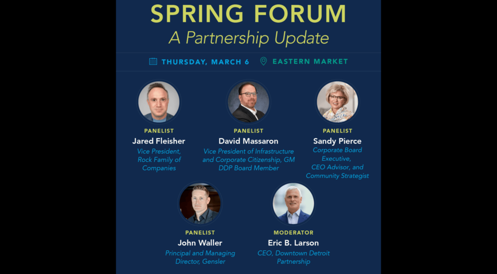 The Downtown Detroit Partnership (DDP) will host its annual Spring Forum: A Partnership Update on Thursday, March 6, from 8:30-10:30 a.m. at the historic Eastern Market inside Shed 3. The event was formerly the DDP’s Annual Meeting.