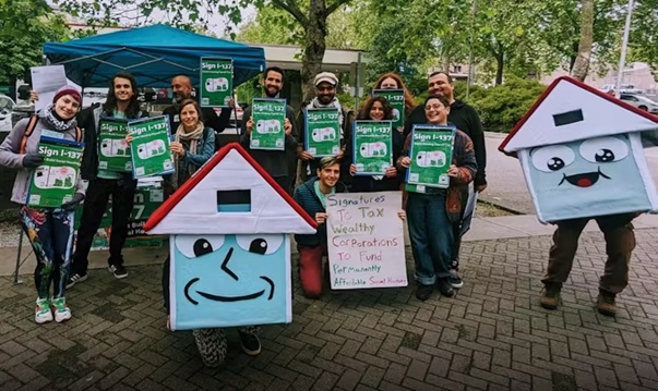 Activists in Seattle gather signatures to put a social housing initiative on the ballot. In early 2025, voters passed the measure, which implements a payroll tax on high incomes to fund the program. House Our Neighbors, CC BY-SA