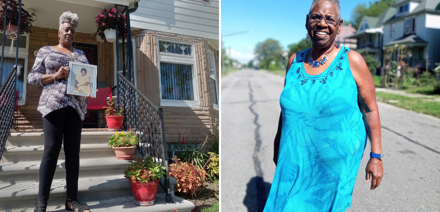 Toyia Watts, 68, of Detroit, left, the president of her neighborhood Charlevoix Village Association, holds a picture of her mother, QT, who moved from Mississippi to Detroit with her husband to purchase the house Watts proudly stands in front of. Daisy Jackson, 67, right, is the Field Street Block Club Vice President.