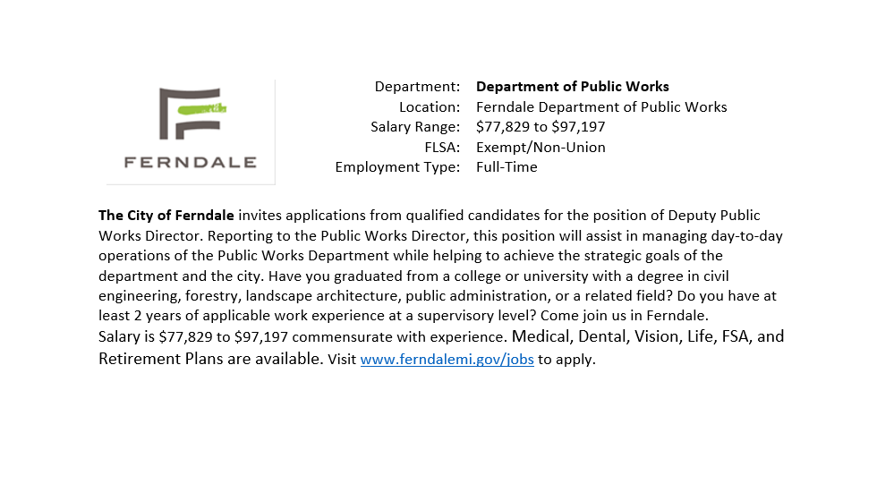 HELP WANTED: City of Ferndale Chicago Defender Newsroom 4 years ago Visit www.ferndalemi.gov/jobs to apply.
