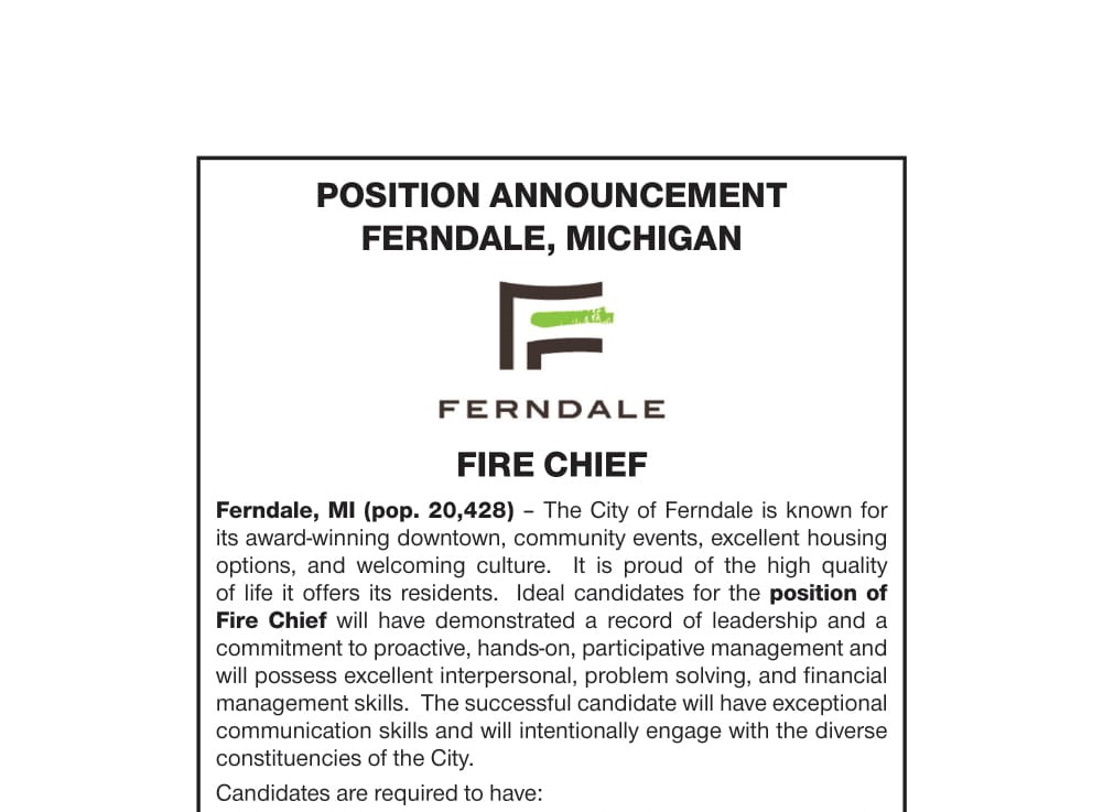 Ferndale, MI (pop. 20,428) – The City of Ferndale is known for its award-winning downtown, community events, excellent housing options, and welcoming culture. It is proud of the high quality of life it offers its residents. Ideal candidates for the position of Fire Chief will have demonstrated a record of leadership and a commitment to proactive, hands-on, participative management and will possess excellent interpersonal, problem solving, and financial management skills. The successful candidate will have exceptional communication skills and will intentionally engage with the diverse constituencies of the City.