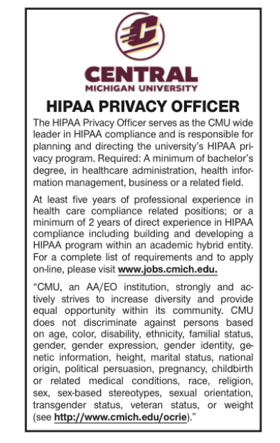 Classifieds HELP WANTED: CMU HIPAA Privacy Officer Chicago Defender Newsroom April 21, 2021 About Post Author Chicago Defender Newsroom See author's posts From the Web