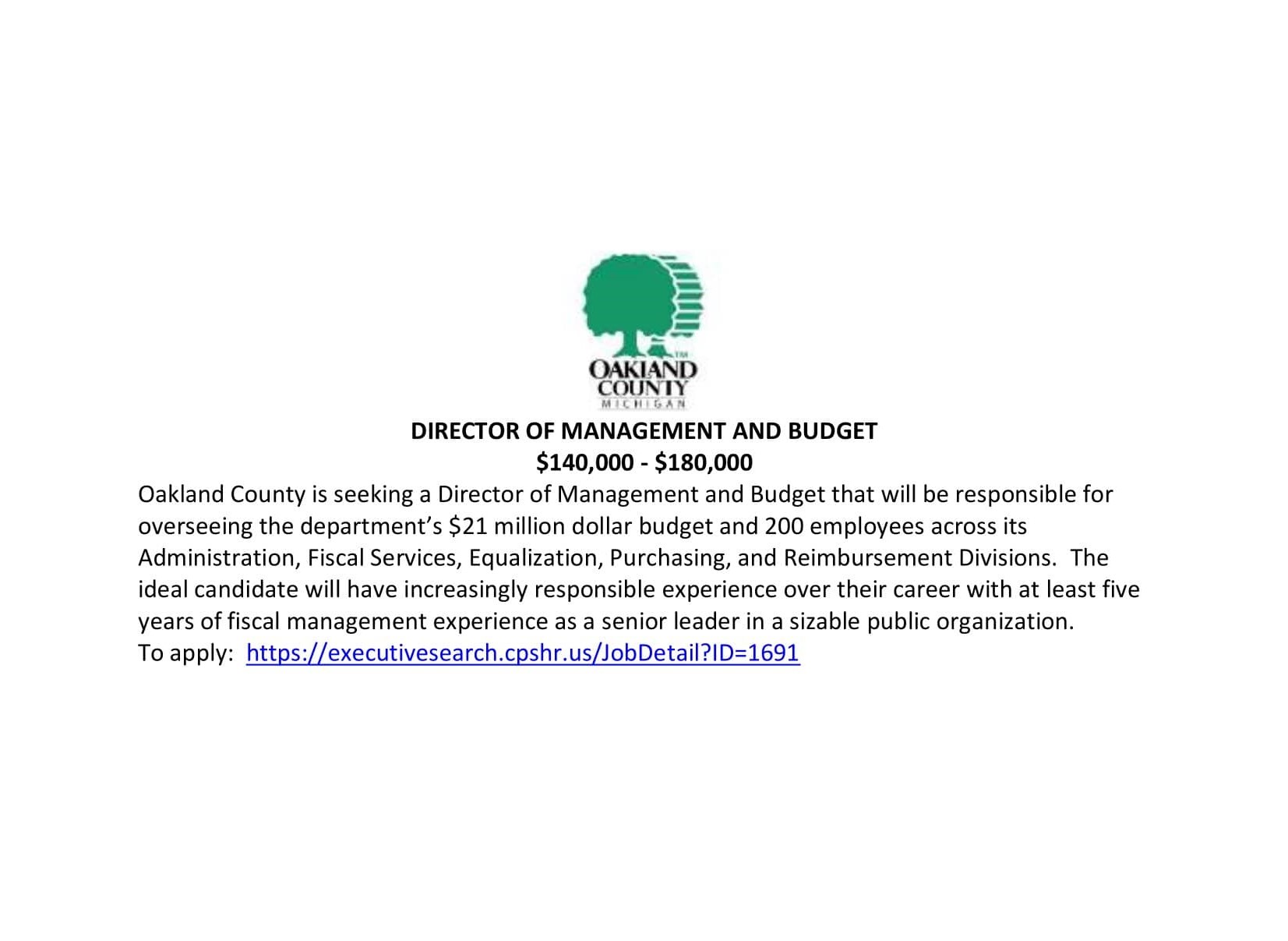 HELP WANTED: Oakland County Director of Management and Budget