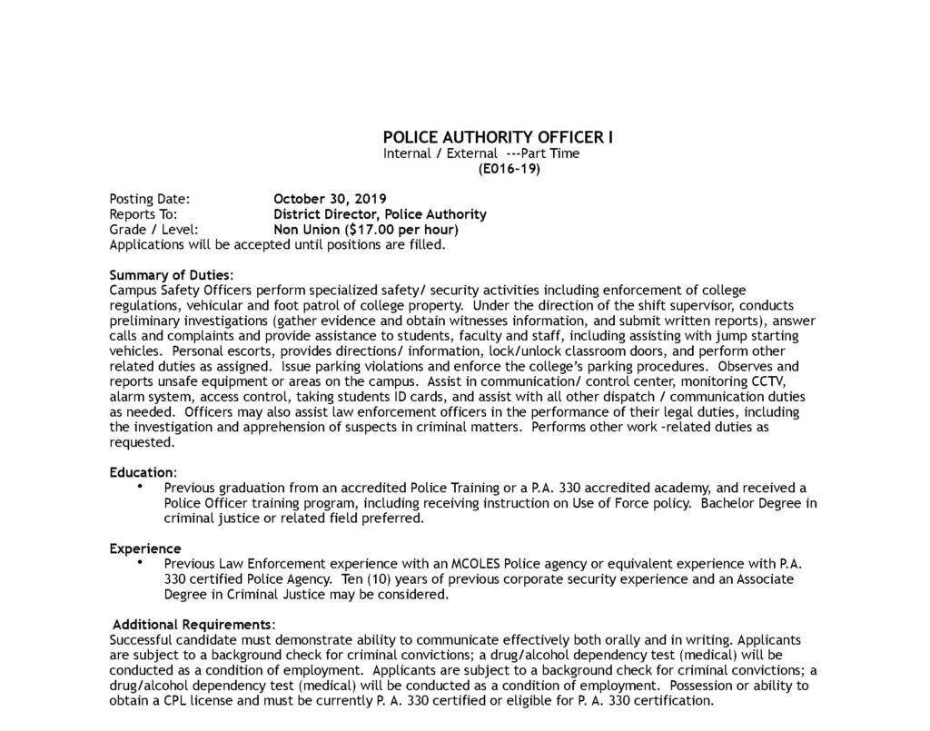 Successful candidate must demonstrate ability to communicate effectively both orally and in writing. Applicants are subject to a background check for criminal convictions; a drug/alcohol dependency test (medical) will be conducted as a condition of employment. Applicants are subject to a background check for criminal convictions; a drug/alcohol dependency test (medical) will be conducted as a condition of employment. Possession or ability to obtain a CPL license and must be currently P. A. 330 certified or eligible for P. A. 330 certification.
