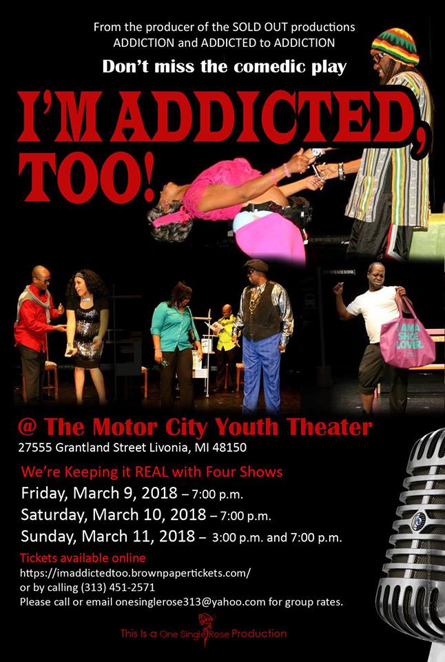 Now One Single Rose presents I’m ADDICTED, Too! the second installment of her comedic play ADDICTION. I’m ADDICTED, Too! keeps it real with comedy as we all have at least one thing that we just can’t go without—that one thing we will go through hell or high water to obtain. I’m ADDICTED, Too! is a unique theater experience with quite a few twists as sometimes we don’t view our normal behavior as an addiction. The audience will also have an opportunity to reveal the writer’s addiction to win a prize at each performance. I’m ADDICTED, Too! opens on March 9, 2018, and runs through March 11, 2018. Shows are scheduled on Friday and Saturday at 6:30 p.m. with a 7:00 p.m. show time, a 3:00 p.m. Sunday matinee and a 7:00 p.m. evening show at the Motor City Youth Theater, 27555 Grantland Street in Livonia, Michigan. If I’m ADDICTED, Too! sells out March 9-11, 2018, there will be additional shows added the following weekend. Tickets are available online https://imaddictedtoo.brownpapertickets.com or by calling (313) 451-2571. For more information please contact (313) 451-2571, email onesinglerose313@yahoo.com or visit www.onesinglerose.com