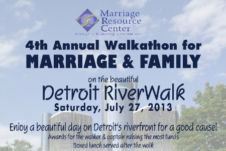 Participants of the Walkathon, which will begin on the Detroit RiverWalk at 9:00 AM on the Rivard Plaza July 27, 2013, will take a five mile walk down the RiverWalk, up the Dequindre Cut and back. Walkers will include families, teens, single parents, engaged couples, long-married couples, struggling couples, and step families who desire to stand with MRC as they seek to raise funds and increase community awareness about the low to no cost resources it offers. In existence since 2004, MRC also provides services to at risk youth, ex-offenders, and those seeking substance abuse rehabilitation.