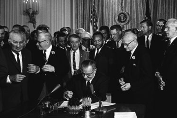 President Lyndon B. Johnson signs the 1964 Civil Rights Act as Martin Luther King, Jr., and others, look on, July 2, 1964. Photo: Cecil Stoughton, White House Press Office (WHPO), via Wikimedia Commons