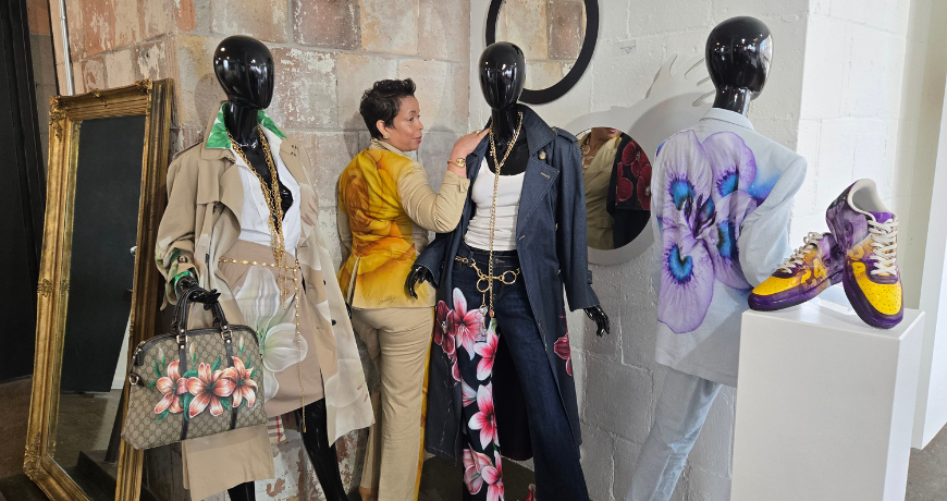 At the core of La’ Merde Designs is its dedication to repurposing vintage couture. As environmental concerns grow, brands like La’ Merde Designs are redefining their operations to prioritize sustainability. Founder Burkett combines artistry and innovation by carefully selecting secondhand pieces, digitally designing custom murals and patterns, and collaborating with Detroit artist Fella, who hand-paints each design.