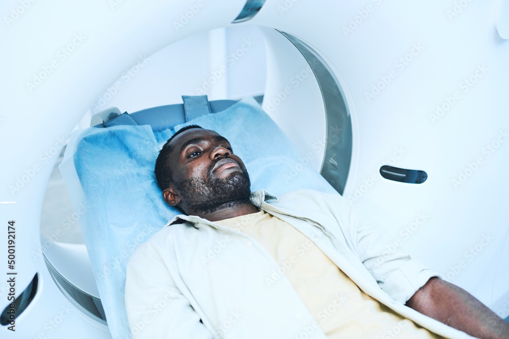 Hospital Radiology Room: Woman Standing next to X-Ray Machine While it Scans Chest Chest, Back, Lungs. Adobe Stock Photo