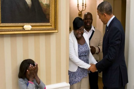 The image, taken by White House photographer Pete Souza, shows 8-year-old Janiya covering her face with her hands, overcome with excitement at meeting the president. Her mother, Breale Gray, stands in the doorway, beaming as she holds on to Obama’s hands.