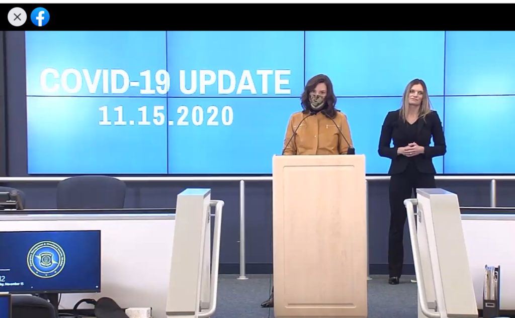 Governor Gretchen Whitmer spoke during the roughly 40-minute press conference today with MDHHS officials on the three-week pause to “share a little more perspective” as the state prepares itself for the “tough months ahead.”