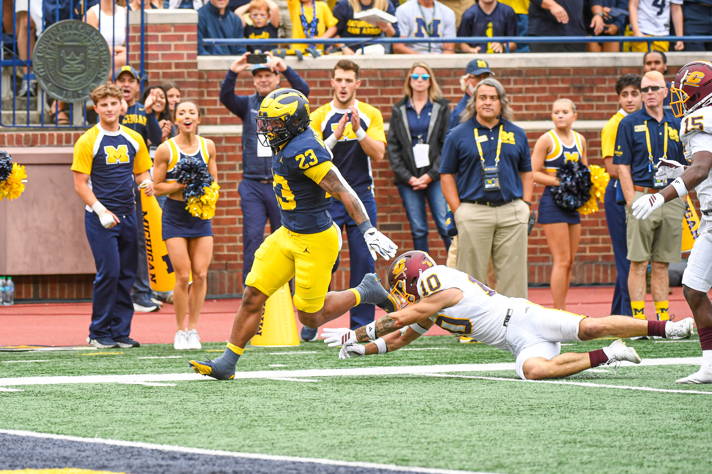 The highlights didn’t just come on offense for the Wolverines as the Michigan defense also played exceptionally well. Let’s start with the team holding the Chippewas to negative total yards in the first quarter and zero touchdowns in the game. Overall, CMU had only 139 yards and converted just eight first downs against a very stingy, quick and physical defense led by Jaishawn Barham who had two of the team’s three sacks (the other by Jyaire Hill). And we certainly cannot forget about freshman Elijah Dotson who wasn’t going to let Underwood, his former high school teammate and friend from Belleville, have all the highlights. Dotson had one of his own getting his first career interception in the third quarter.