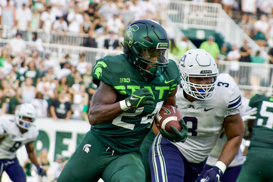 Michigan State’s offense was humming and the Akron defense had no answers in slowing down Michigan State’s running backs that put up 260 yards (Jalen Berger – 107 yds, Jarek Broussard – 81 yds, and Elijah Collins – 57 yds). Quarterback Payton Thorne threw the ball 28 times for over 200 yards but also threw 2 interceptions in the game.