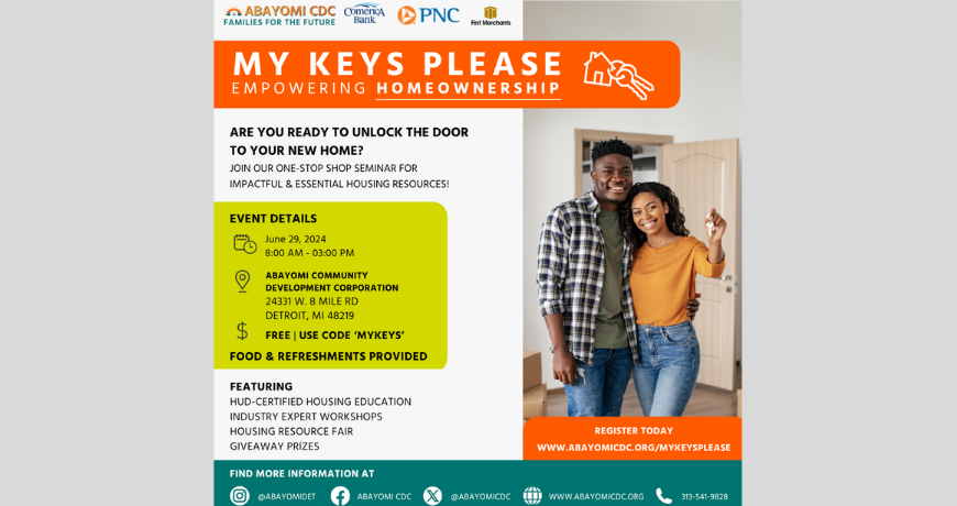 Abayomi Community Development Corporation (Abayomi CDC) is excited to share the details of an upcoming event called “My Keys Please: Empowering Homeownership,” which will take place on June 29. This transformative and free housing seminar is designed to equip aspiring homeowners and second-time buyers with the essential knowledge and resources to make well-informed decisions about investing in their future.