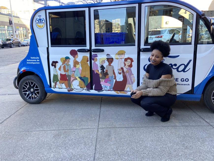 Detroit School of Arts student Brooke Snow poses by a new Ford autonomous vehicle with her artistic touches represented on the vehicle.