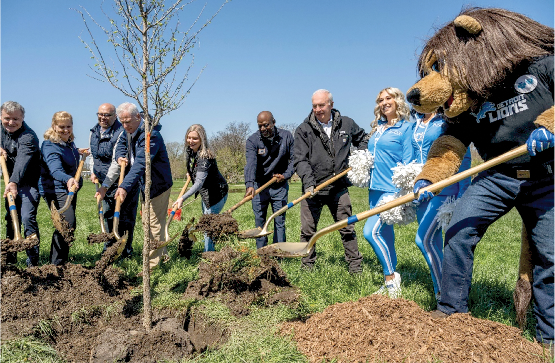 The Earth Day event welcomed volunteers from the NFL, Verizon, DTE and other DTEP partners and featured speakers like the director of NFL Green Jack Groh, vice president of the Detroit Lions Foundation Roxanne Caine and DTE Chairman and CEO Jerry Norcia to recognize the work being done at the planting and by the partnership overall. The Detroit Lions Cheerleaders and mascot also joined the celebration.