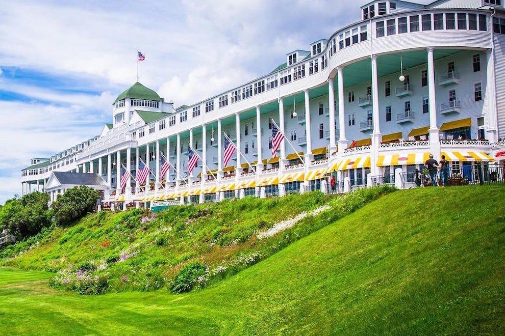 Motor vehicles are prohibited on Mackinac Island and visitors get there by ferry or plane. The hotel is open from early May through late October and visitors are greeted by its 660-foot-long (201-meter-long) porch.