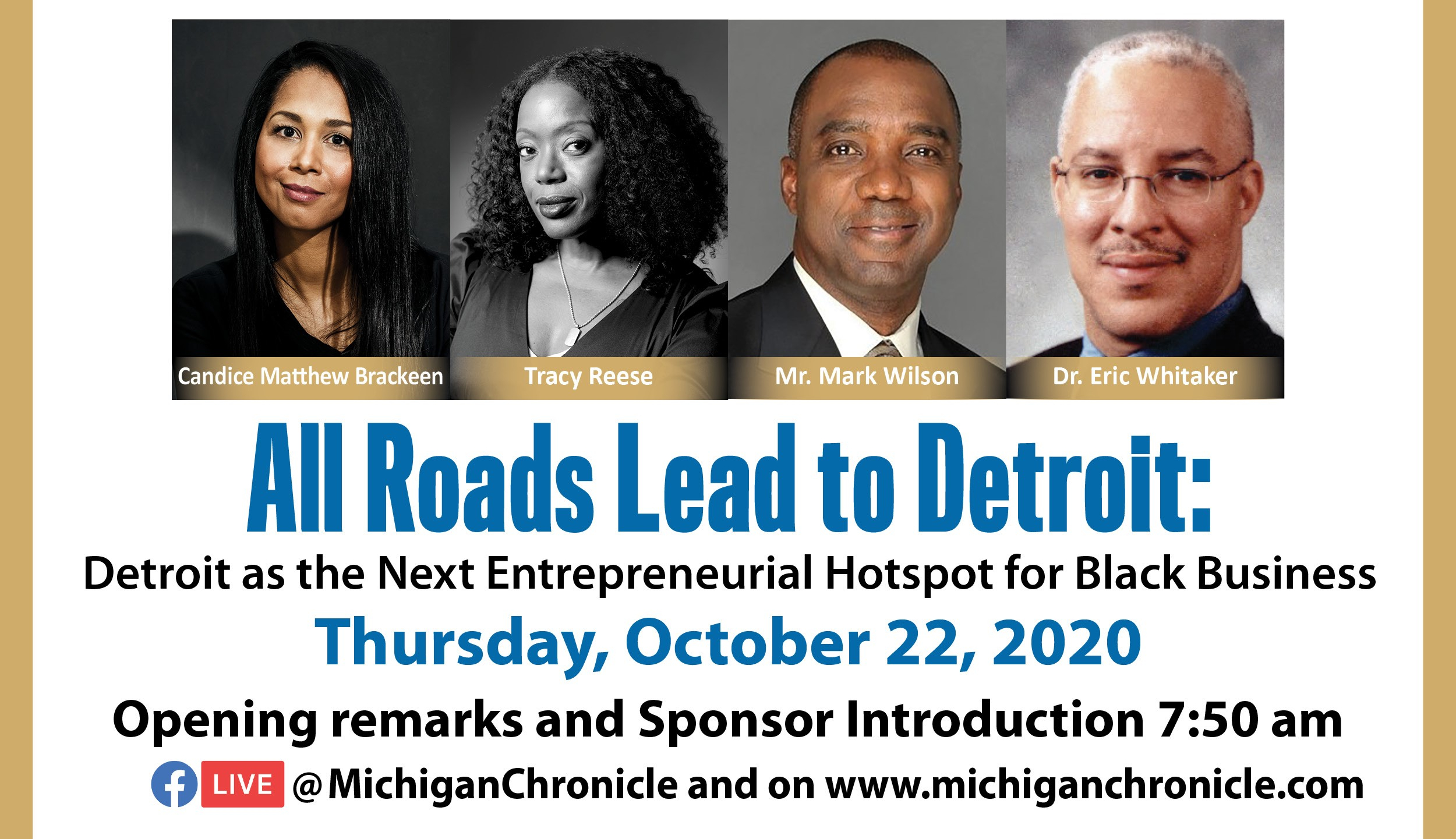 The Michigan Chronicle’s Pancakes & Politics highlights pressing business, civic, and economic topics, bringing together a diverse group of policy and decision-makers, influencers, and business and community leaders. On Thursday, October 22, 2020, join the Michigan Chronicle and Co-Moderators Dennis Archer Jr. and Vickie Thomas as we host Pancakes & Politics Forum V – Digital Edition. The theme of Forum V is “All Roads Lead to Detroit: Detroit as the Next Entrepreneurial Hotspot for Black Business”.