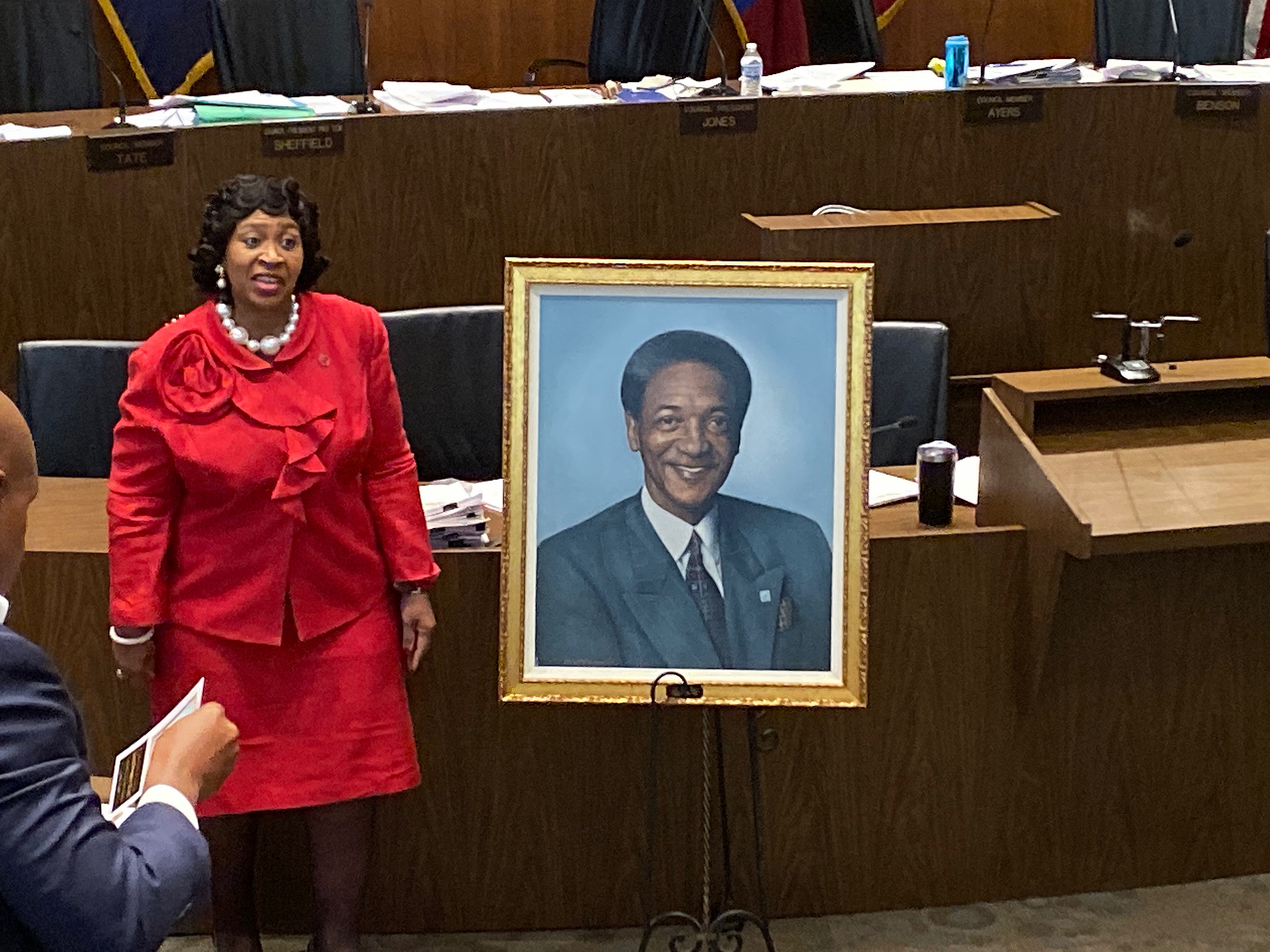Following tradition, the portraits of former Detroit City Council presidents hang inside City Hall in the “Committee of the Whole Room.” Hill’s portrait was unveiled Tuesday during a ceremony inside the Erma Henderson Auditorium. Henderson was the first African American woman to elected to Detroit City Council in 1972 and the first to serve as president from 1978-1989.