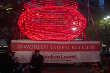 DETROIT (WWJ) – The Salvation Army put the metal to the kettle Thursday morning in Campus Martius Park. What’s billed as the world’s tallest red kettle was lowered into place, a symbol of the organization’s annual holiday fundraising drive.