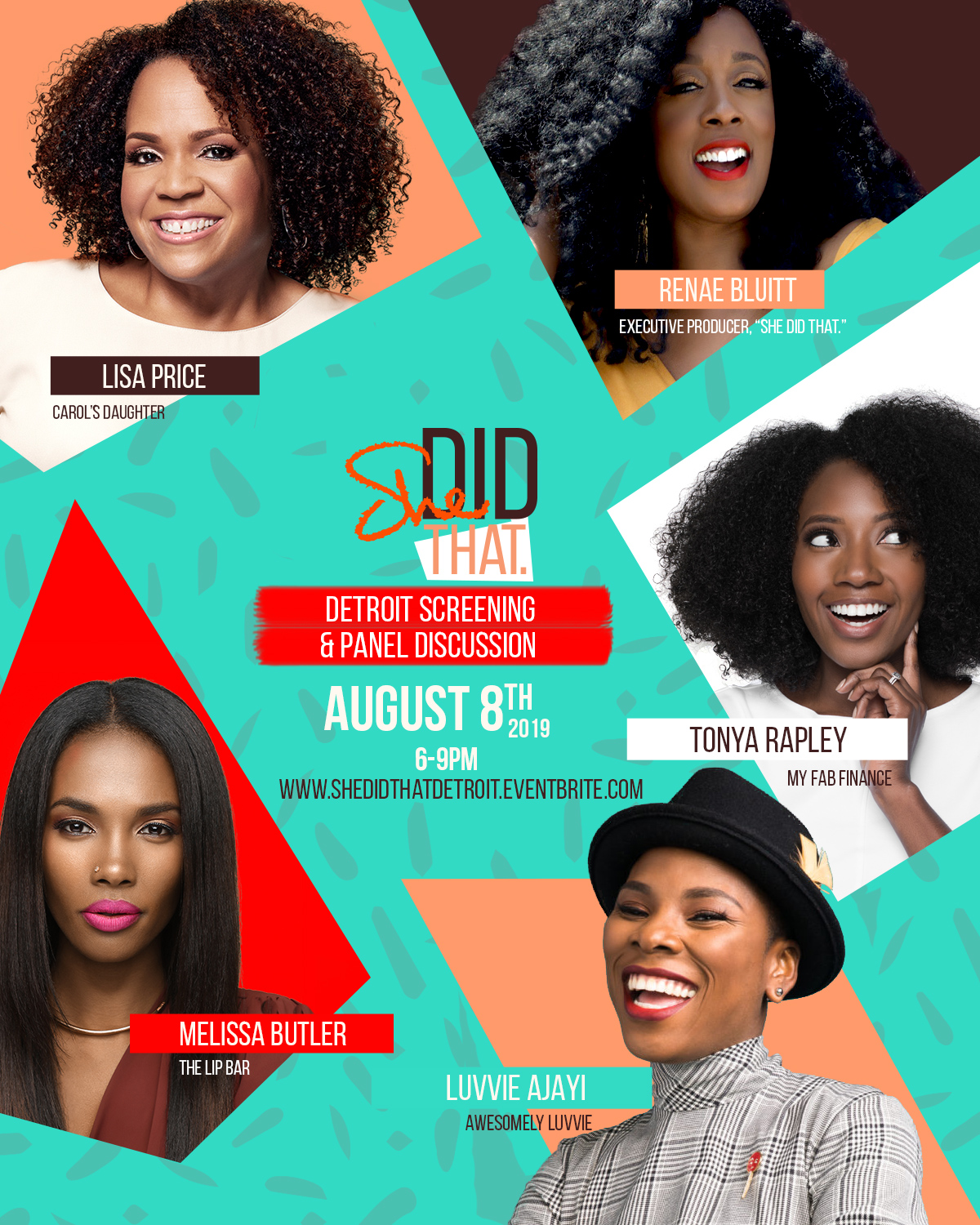She Did That., a timely and poignant documentary film celebrating the passionate pursuits of Black women and their entrepreneurship journeys, will premiere in Detroit at the Aloft Hotel on August 8, 2019. The film, executive produced by Renae Bluitt, examines the professional and personal experiences of four exceptional entrepreneurs, providing audiences the opportunity to walk in their shoes and discover how they overcame adversity, made history, and built lasting legacies. The screening event will include a “She Did That.” marketplace featuring local woman-owned businesses and a post-screening Q&A session moderated by Kimberly Dobine featuring: Renae Bluitt (“She Did That.”), Melissa Butler (The Lip Bar), Kelli Coleman and Anika Jackson (The Ten Nail Bar), and Gwen Jimmere (Naturalicious Beauty). The event is open to the public and tickets can be purchased at shedidthatdetroit.eventbrite.com.