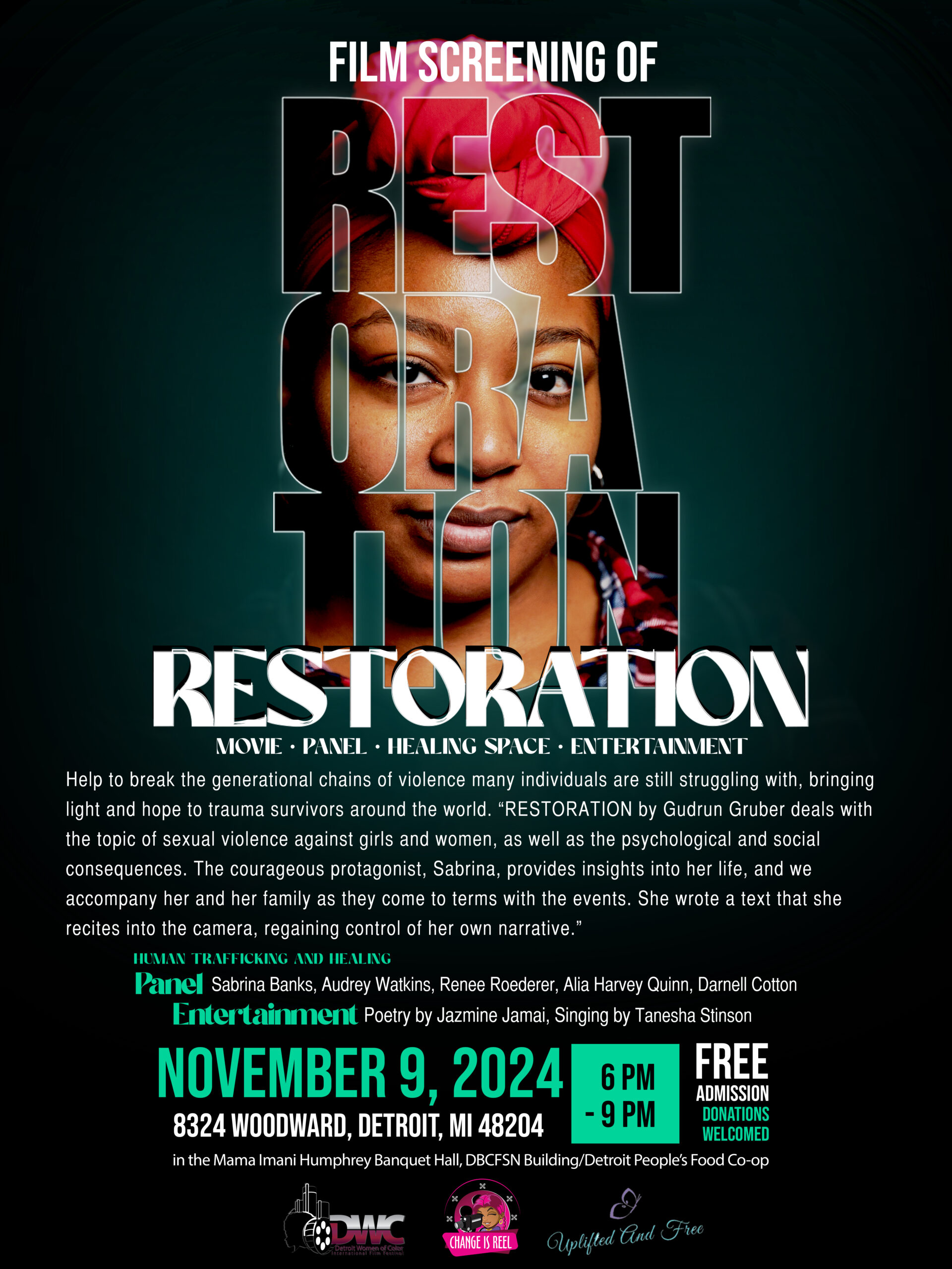 In addition to the public screening of “Restoration,” a panel of advocates will convene at the venue to discuss the perils of human trafficking, sexual violence, and healing. The panel will consist of Sabrina Banks (survivor and Founder/CEO of Uplifted and Free, LLC), Audrey Watkins (CEO of Resourceful Woman), Renee Roederer (Senior Director of Programs and Community Care at Epilepsy Foundation of Michigan), Darnell Cotton (Advocate and Banks’ father), Alia Harvey Quinn (Founder of FORCE Detroit), and Kalimah Johnson (Founder and Executive Director, SASHA Center).
