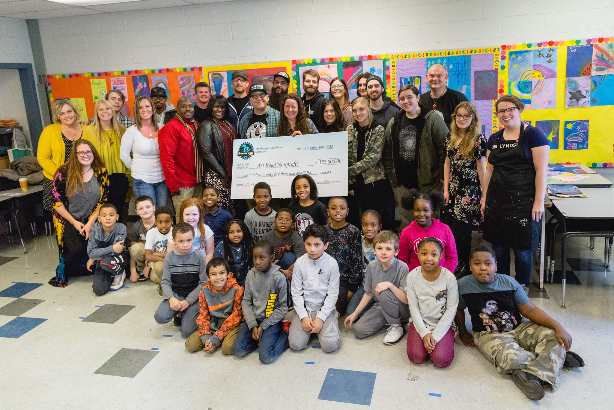 The Michigan Glass Project auctions off donated glass art to support the artists of tomorrow. The project selected a nonprofit, Art Road, for a $125,000 donation to advance their work as the only 501(c)(3) in Michigan bringing art class back into schools, for the entire school year, as part of the regular curriculum. Representatives from The Michigan Glass Project presented the check to Art Road Executive Director Carol Hofgartner on Friday, December 14, 2018, at the Ralph J. Bunche Elementary School, at 503 Hyacinthe Street, in Ecorse, Michigan 48229.