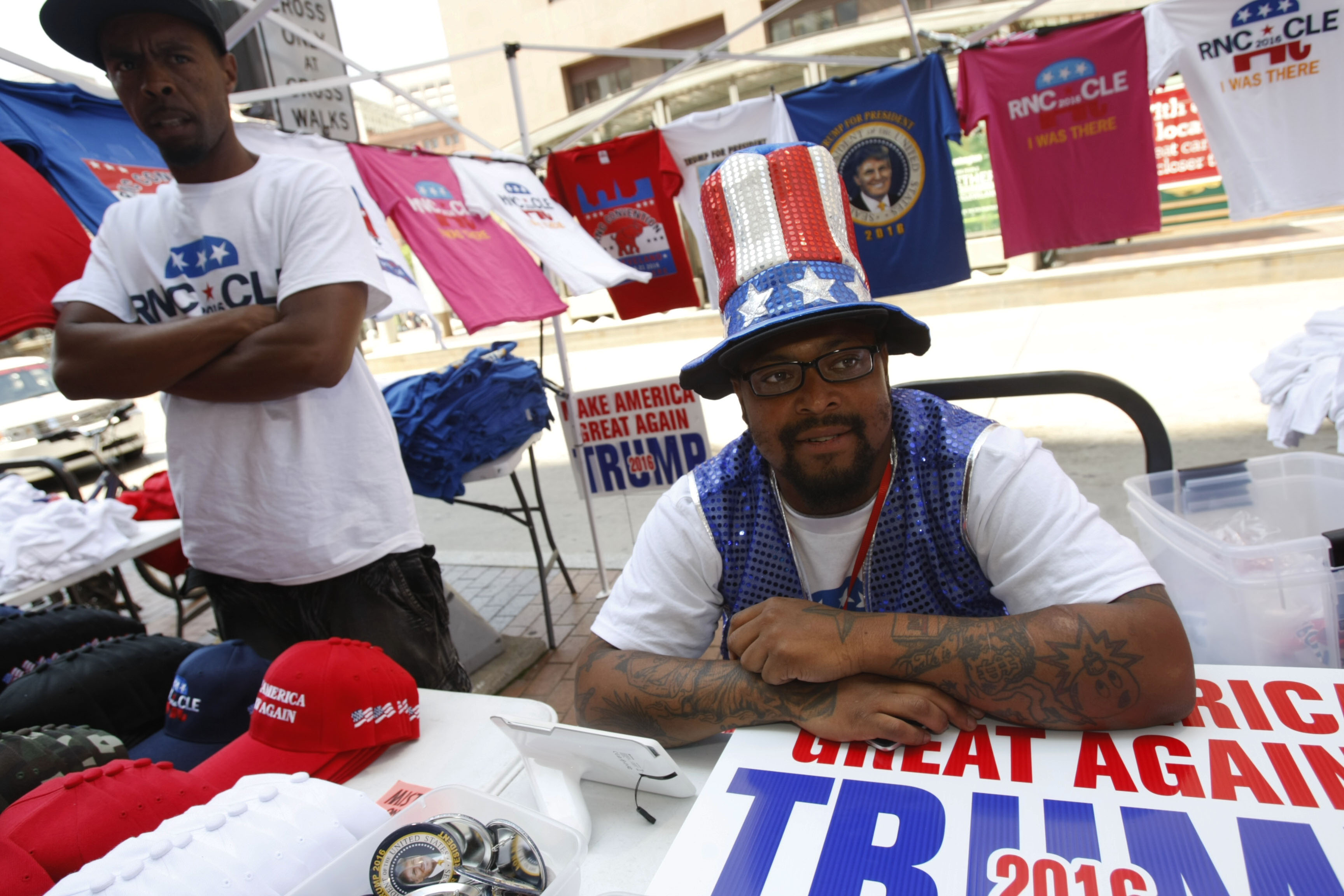 Shy Drayton, 21, said she will follow Republican presidential candidate Donald Trump throughout the remainder of his campaign. Drayton, however, is not a Trump supporter. Instead, she is one black street vendors sprinkled among the scores temporary merchants flooding downtown Cleveland streets for the opportunity to sell novelty items to thousands of visitors at the Republican National Convention (RNC) in Cleveland. Some, surprisingly, are Trump supporters. Others, like Drayton, have different motives for being here. “I don’t agree with his policies,” she said. “I’m out here for a purpose — to pay my bills. It’s easy to separate business from personal.”
