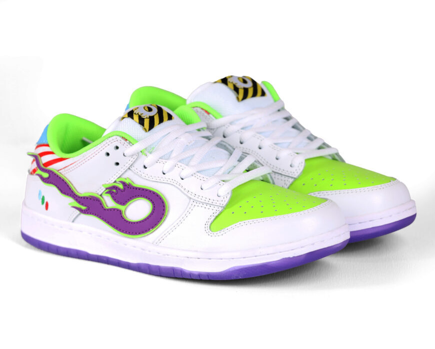The Space Ranger-inspired “Lightyear Low Top Sneakers ” are crafted from buttery smooth cow leather, with macabre uppers overlaid and accompanied with vibrant green appliqué, bone patches with glow-in-the-dark midsole. Owners Ty Haygood and Bird Anderson are disrupting the streetwear and shoe industry with their growing clothing brand, favored by local celebrities such as MIA Babyface.