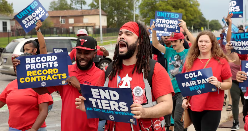 The UAW’s list of demands includes eliminating wage tiers, a 40% wage increase over the lifetime of the contract, restoring the cost-of-living allowance adjustments, defined benefit pensions for all workers, the right to strike over plant closures, and increased benefits to current retirees among other items.