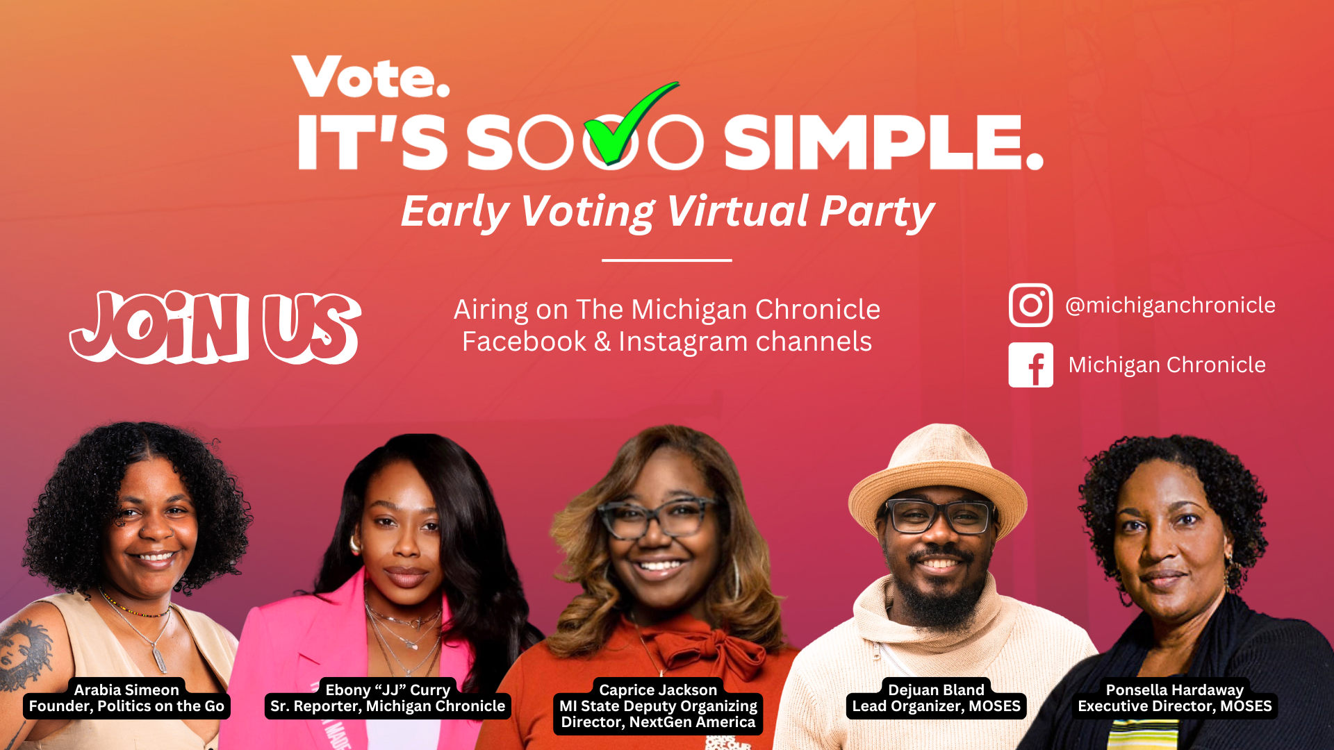The SOOO Simple. Early Voting Virtual Party is here to get new or seasoned MI voters prepped to VOTE EARLY! Get voting tips, resources and hear from a brilliant panel discussing as you get everything youT need to know to make voting simple and easy.