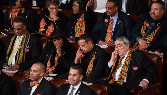 Of the Democrats who were there — many boycotted — the ones who stood out the most were the Congressional Black Caucus (CBC) members, who were draped in Kente cloth, presumably to protest Trump’s supposedly alleged comments where he preferred to African nations as “shithole countries.”